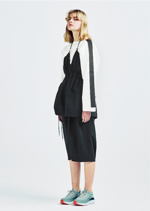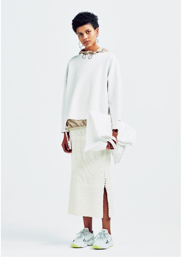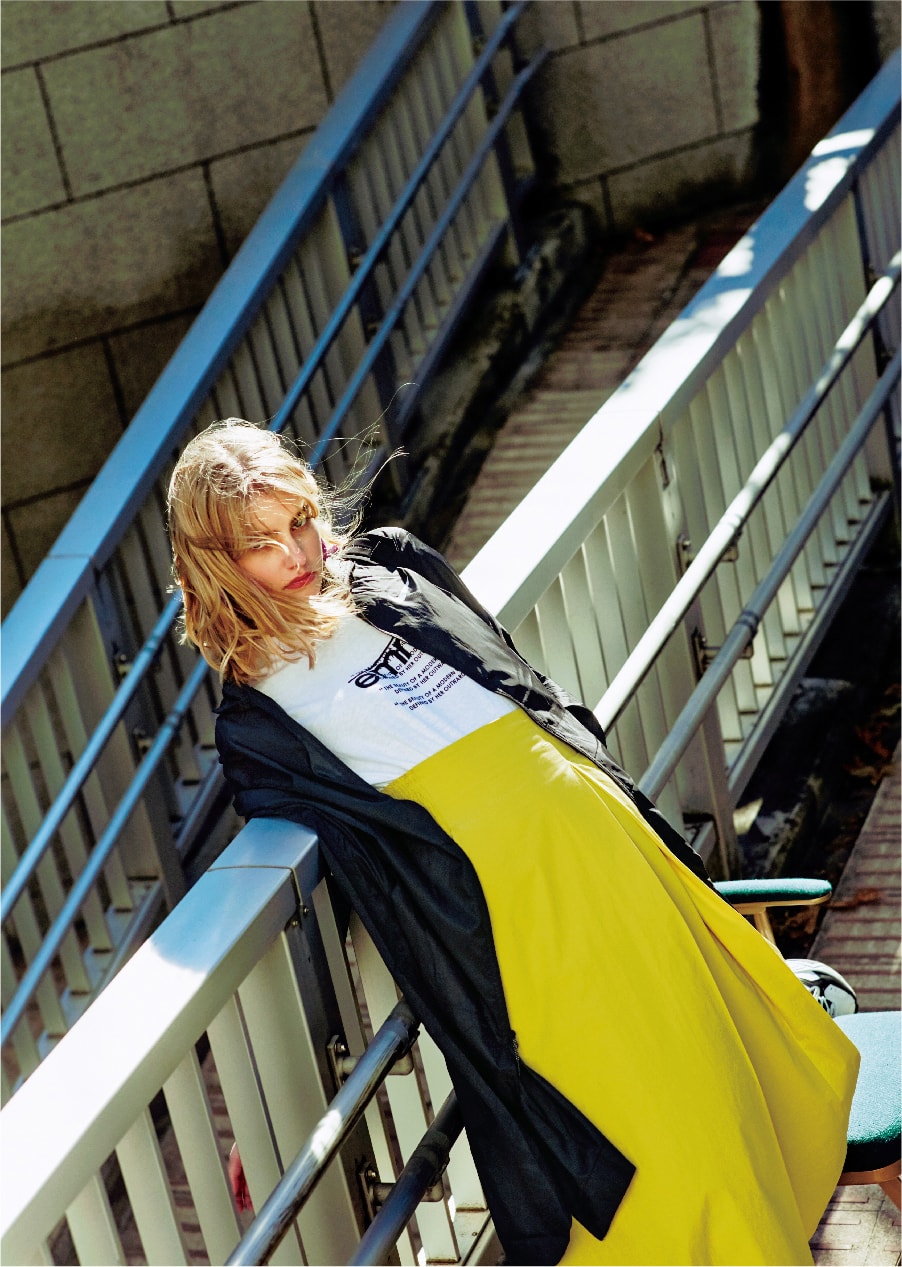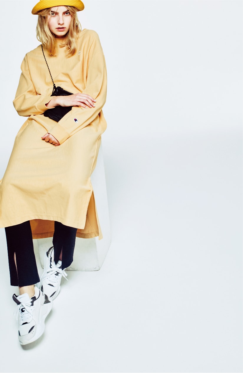 モードスタイルを後押しする足元の90‘sテイスト。クリーンな白にライムイエローを差した、emmiらしい配色の別注モデルです。