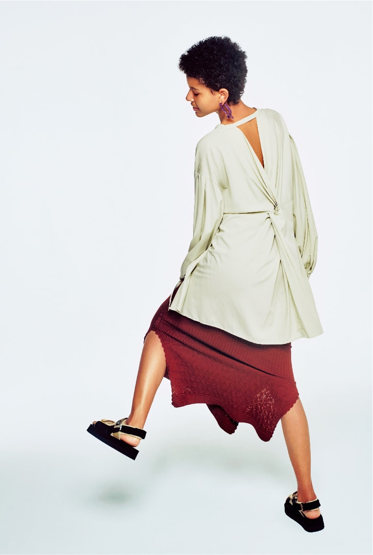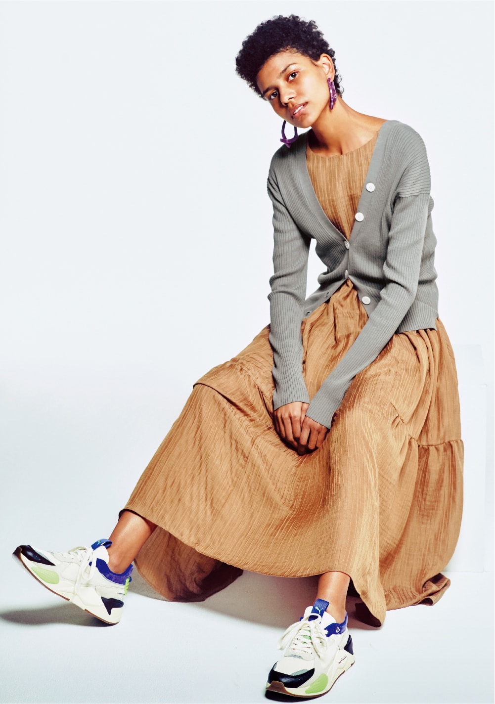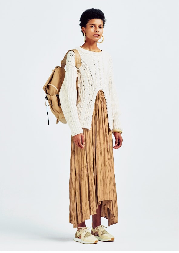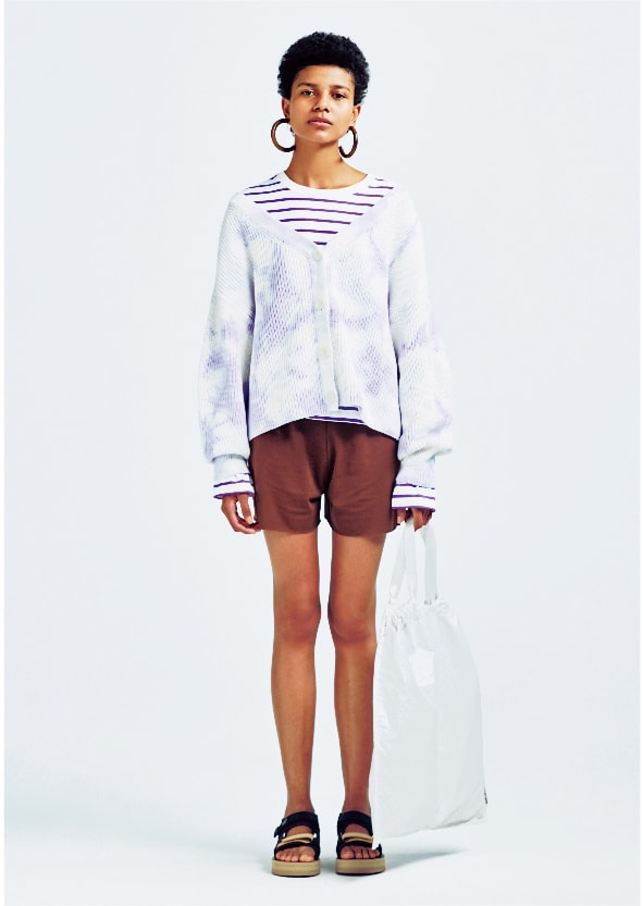 モードスタイルを後押しする足元の90‘sテイスト。クリーンな白にライムイエローを差した、emmiらしい配色の別注モデルです。