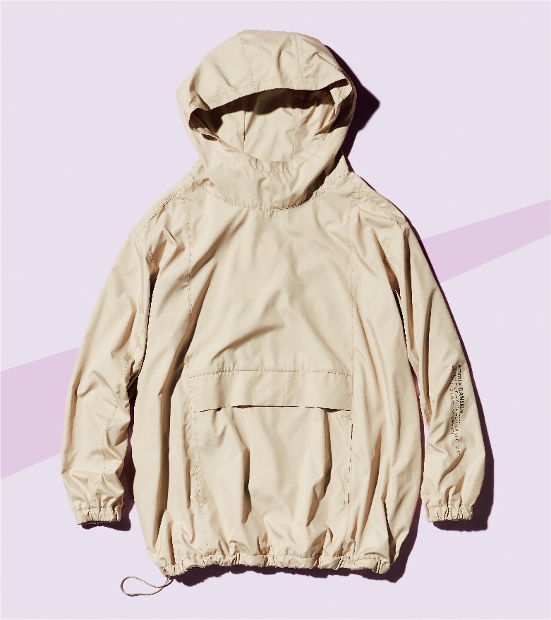スポーティーなデザインでも上品見えするベージュのプルオーバー型ブルゾンを別注オーダー。左袖にWネームプリントをON。