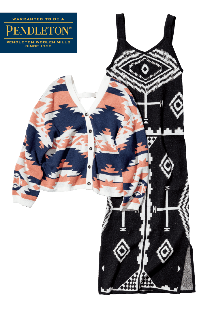 アメリカの老舗ブランド「ペンドルトン」とのコラボ第二弾。定番のネイティブ柄をリラックス感のあるデザインに落とし込みました。 カーデは前後どちらでも着用可能。