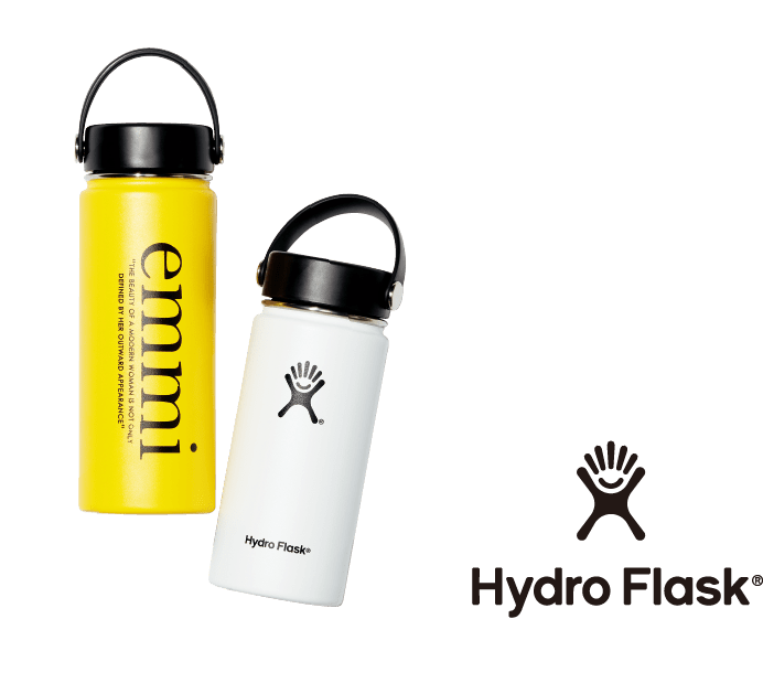 人気のステンレスボトルブランドHydro Flask®とemmiのコラボボトル。 二重壁真空断熱技術を採用しているから保温・保冷性に優れ、長時間温度を保ちます。 シンプルなボトルにロゴが際立つデザイン。