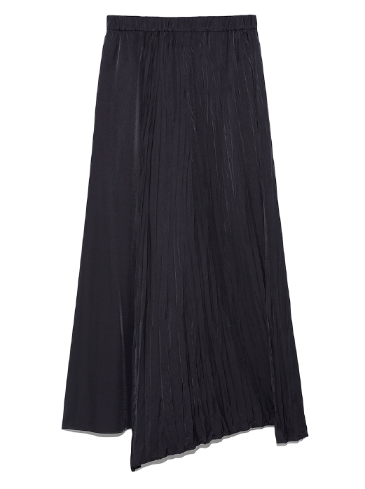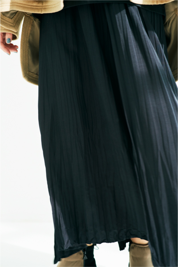 プリーツ加工がある生地とない生地を組み合わせたユニークなロングスカート。裾部分もイレヘムになっているため、どこを前に持ってくるかで見え方が変わり、遊び心のあるコーデが楽しめます。重くなりがちなオーバーシルエットのコートとの合わせも、腰で広がらずストンと落ちるシルエットに整えてくれるありがたいアイテム。