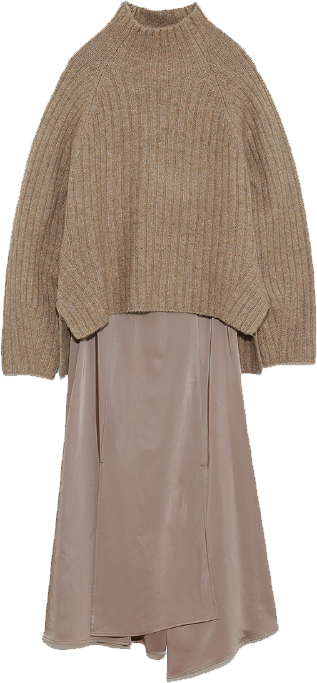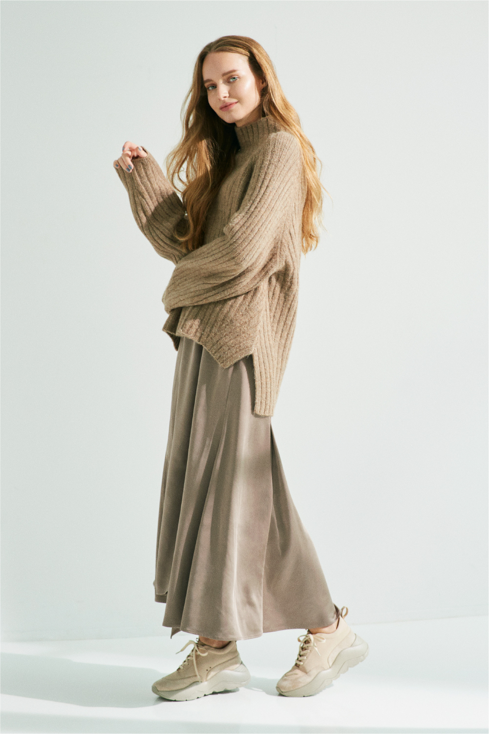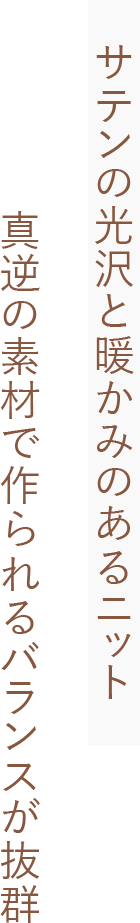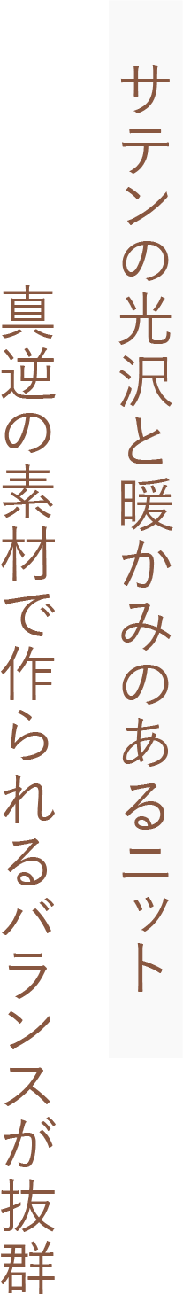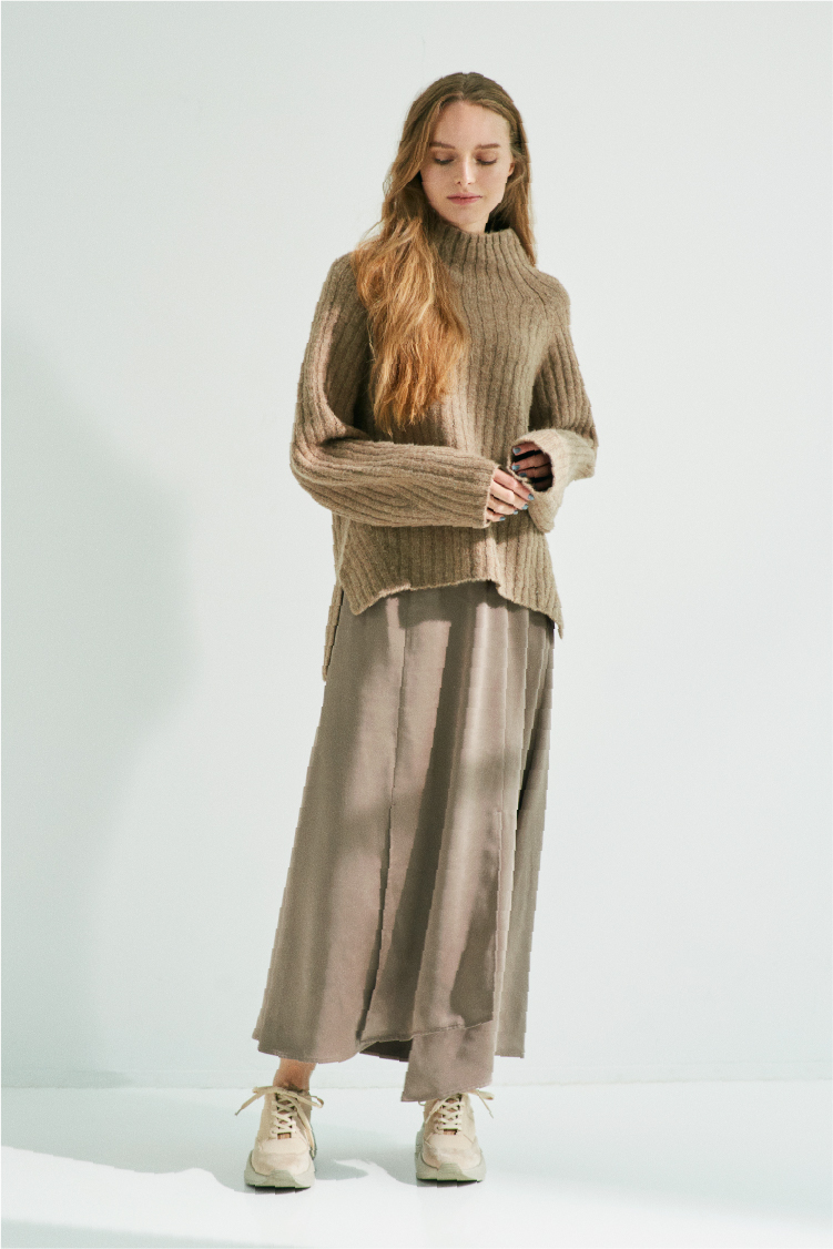 同じトーンの色ながらもあえて全く違った素材をぶつけた、ニットとサテンスカートのセット。この上下の配色具合が絶妙で、ざっくりニットながら、誰が着ても華奢見えするベストなバランス丈で作られています。