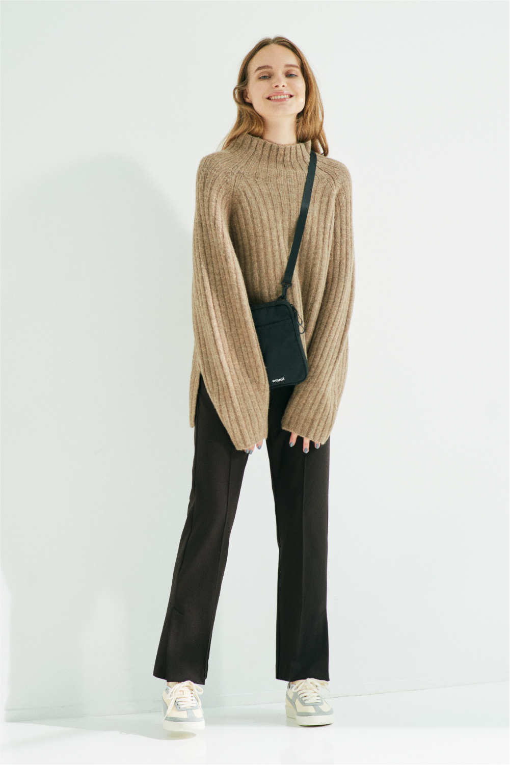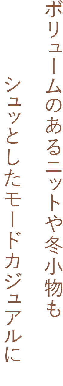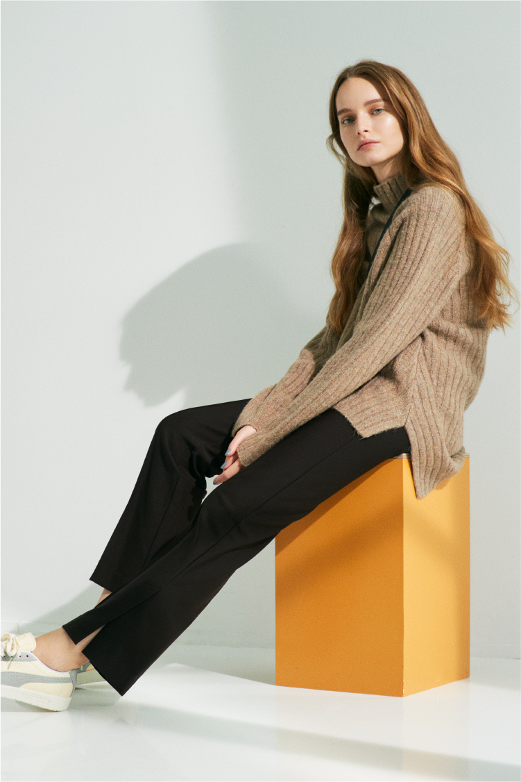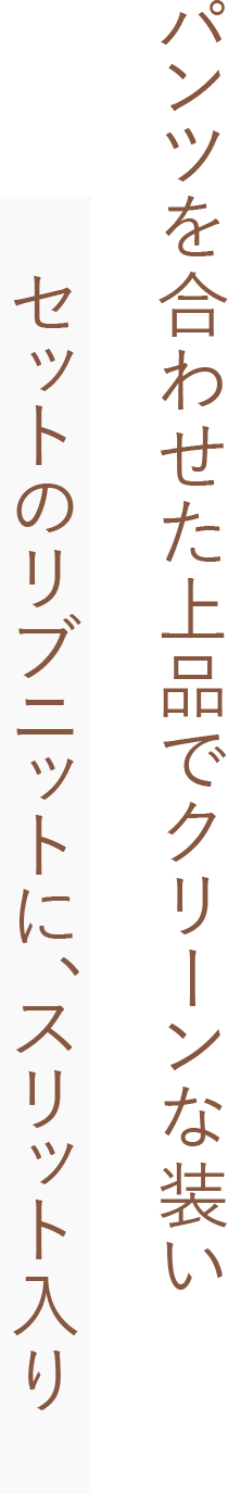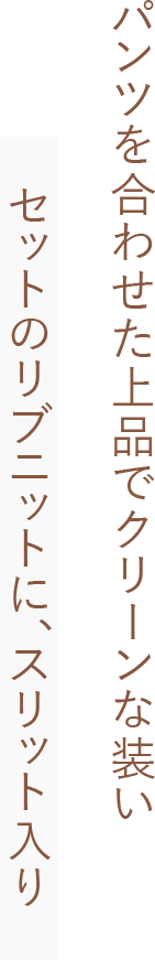 ゆったりとしたシルエットのセットのニットに、脚を真っすぐに見せてくれるスリット入りパンツを合わせたコーデ。お尻がちょうど隠れる丈のニットなので、テクニックなしでこなれたバランスに仕上げてくれます。首から少し離れたボトルネックデザインなため上半身を華奢に見せ、スポーティーな小物と合わせても女性らしい印象にしてくれます。