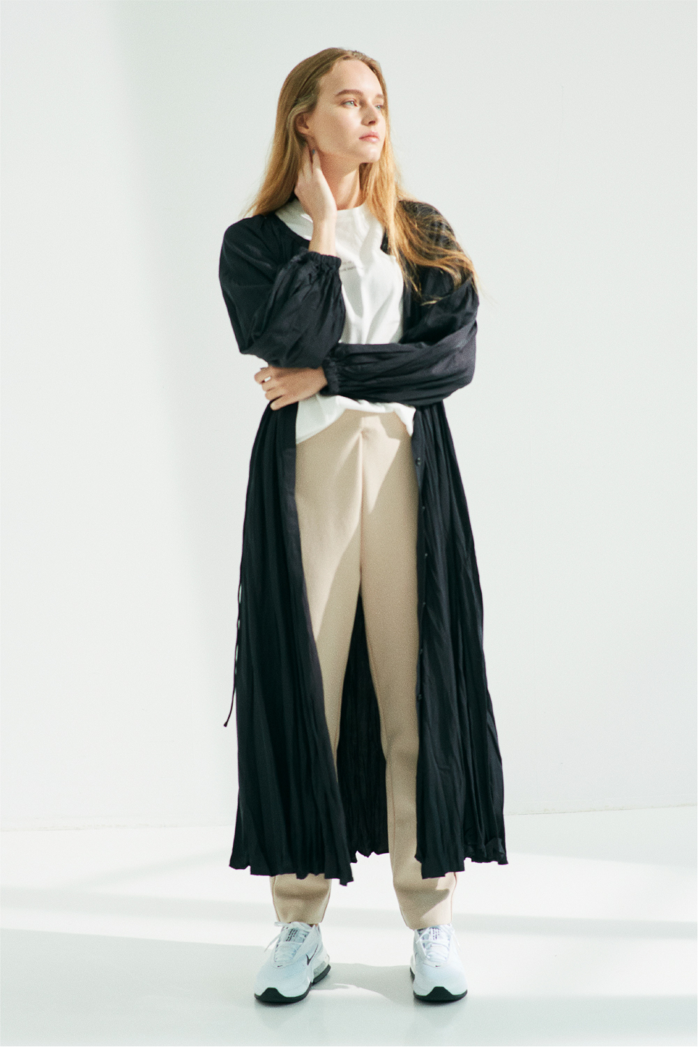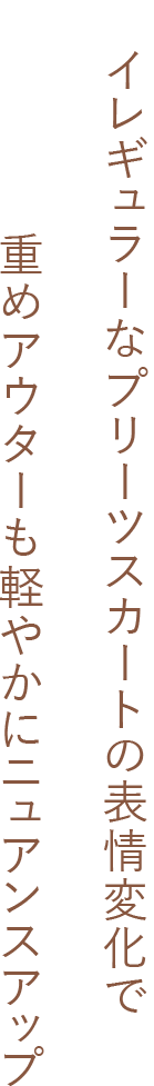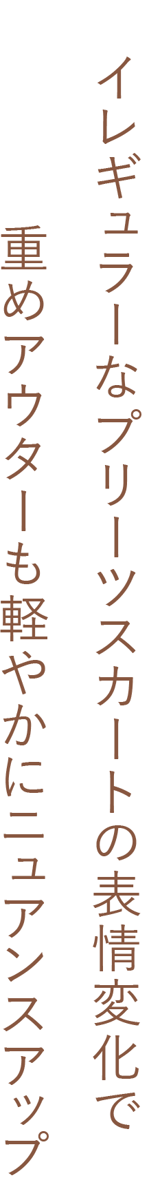 こちらはプリーツ加工のないフラット面を前にし、ボリュームのあるざっくりニットを合わせたコーデ。アシメトリーな裾はスニーカーとのバランスもよく、歩くたびに揺れ動くスカートの表情は、柔らかなモノトーン配色と共に大人の女性らしさを引き出してくれます。