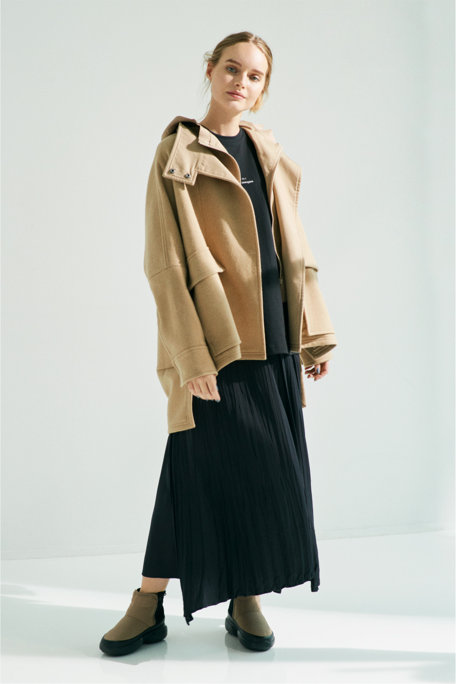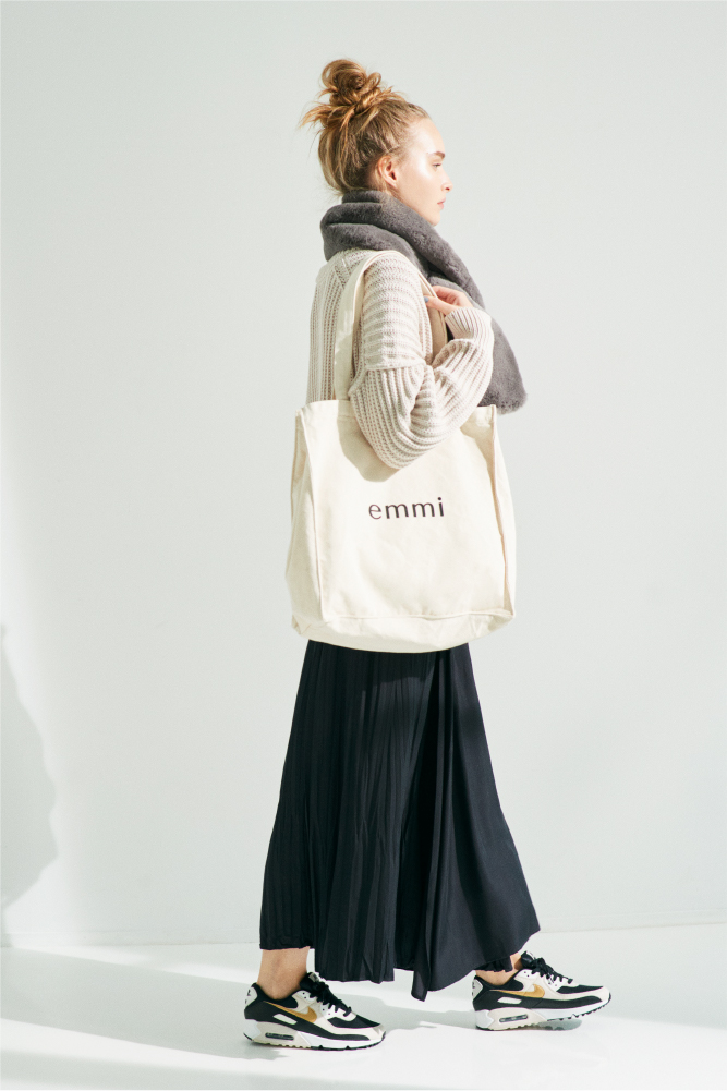 Pleat Skirt 15,000yen+tax Over Wool Coat 35,000yen+tax Logo Tee 5,200yen+tax Shoes 9,000yen+tax(Le coq sportif×emmi)11月入荷予定