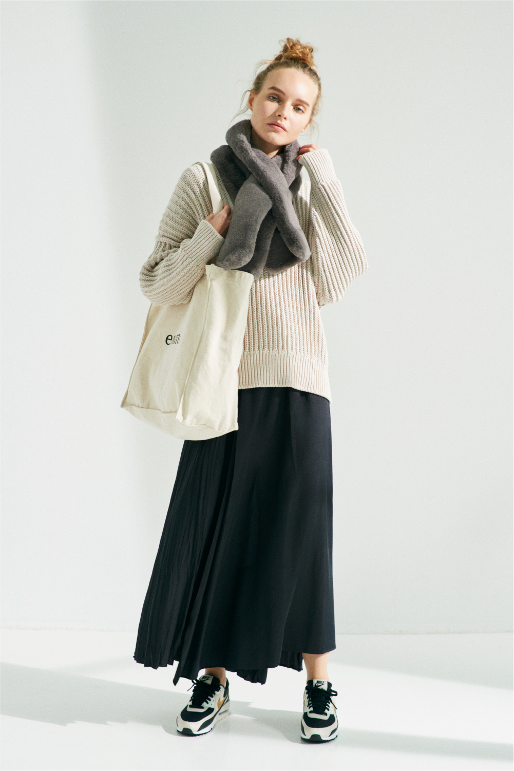 Pleat Skirt 15,000yen+tax Knit 12,000yen+tax Eco Fur Stall 7,000yen+tax Logo Bag 4,500yen+tax Shoes 12,000yen+tax(NIKE)