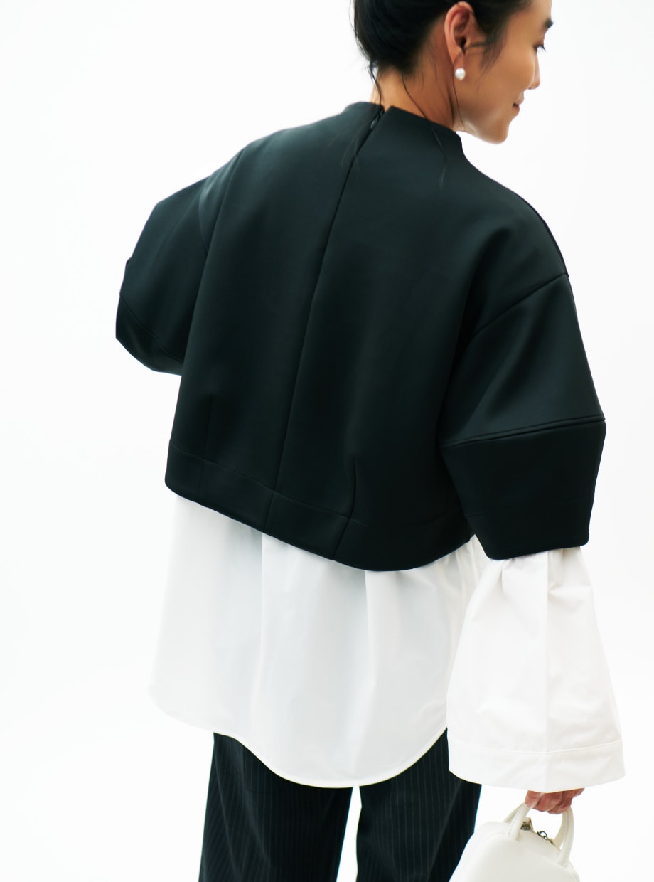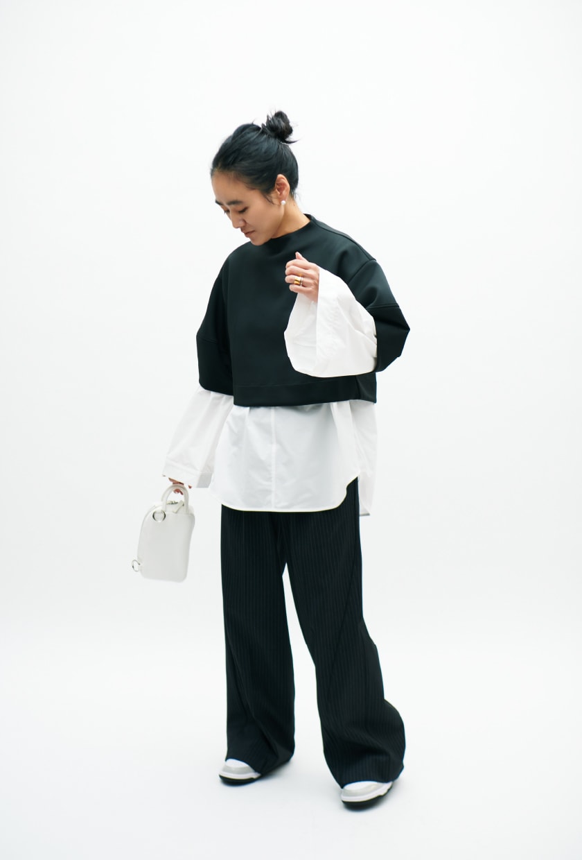 絶妙なバランスでブラウスの袖と裾が出るよう、 重なり具合を緻密に計算して作られたセットアップ。 「ブラウスの生地もボリュームがヘタれずにモードなフォルムを キープし続けられるよう、伸縮性のあるやや厚手の生地に しています。白×黒のレイヤードはよりメリハリのある おしゃれな印象になり、モノトーンの小物たちもスタイリッシュに 引き立ちます。カジュアルなスニーカーも、モード見えします (AYAさん)」
