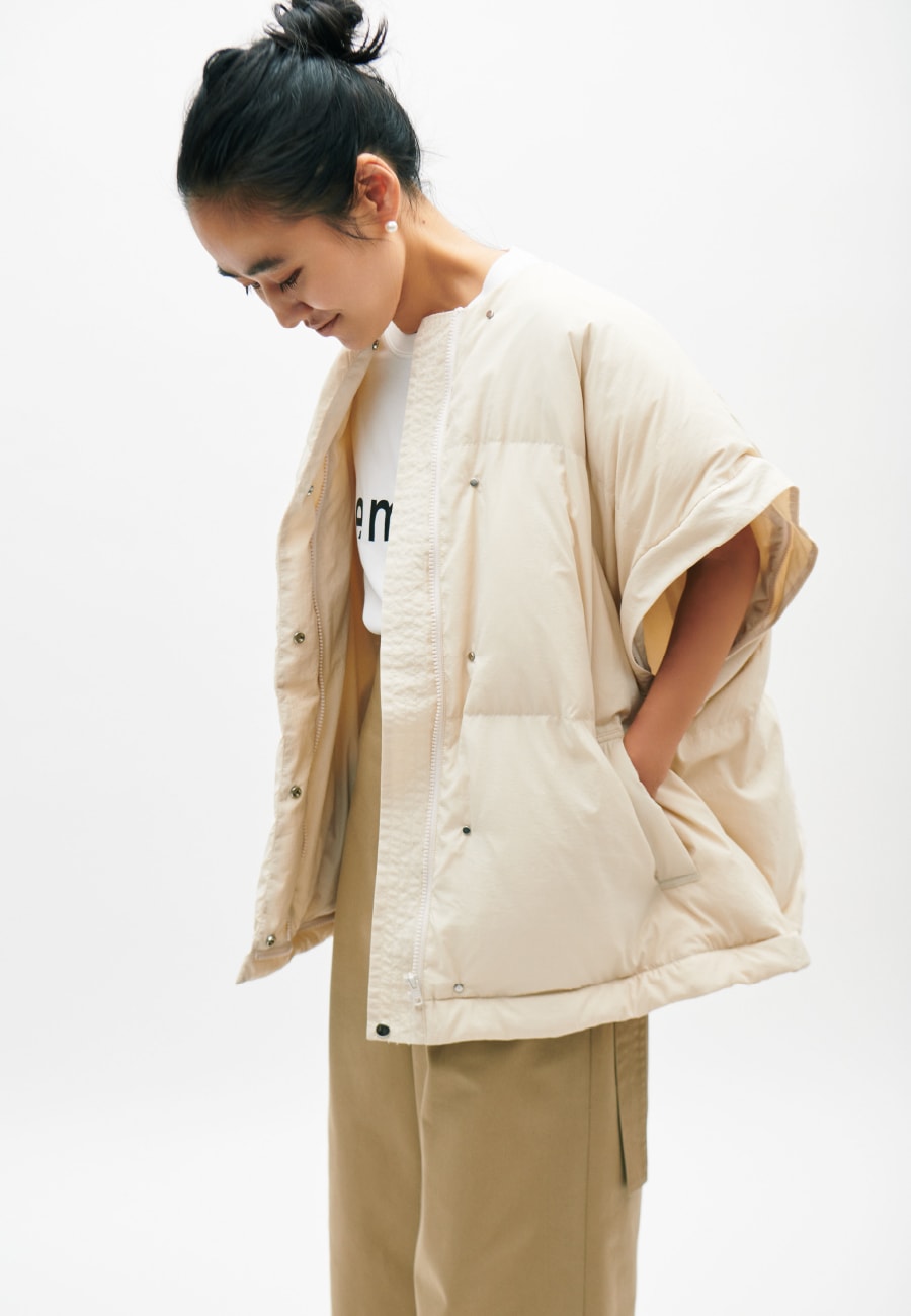 ダウンが苦手な方でも着やすい、女性らしいダウンをemmiと共に作り続けるAYAさん。 「今回は特にマルチに着回せて、様々な表情を楽しめるデザインにしました。 同素材でマフラーも付いているので、極寒の日も暖かに過ごせます(AYAさん)」 マットな表面の生地(リサイクルナイロン)には撥水加工も施され、体温をしっかりと閉じ込めてくれるので寒い日も安心。 同素材のマフラーは、単品でウールコートなどにも使えます。