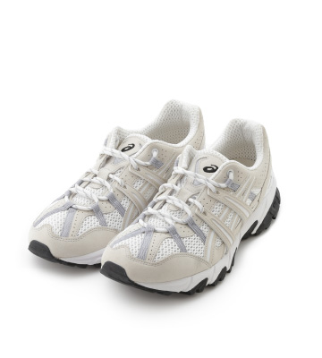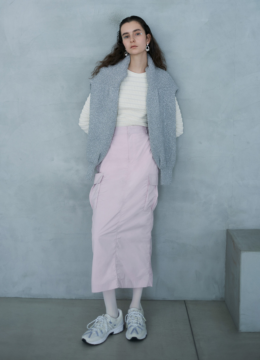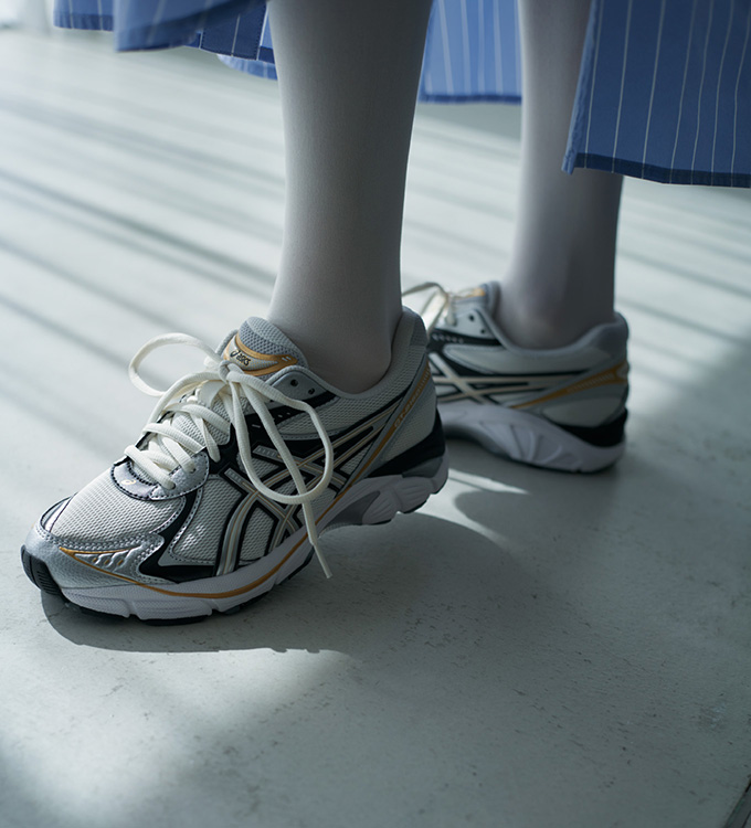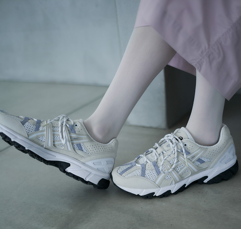トレンドのワークスカートは微光沢とハリ感があり、編地が特徴的なトップスと合わせて上品なスタイリングに。 どちらもウォッシャブルなのが嬉しいポイント。 emmi限定カラーのGEL-SONOMAはトレイルシューズの要素を取り入れながら、淡いカラーリングが女性らしく、デイリーに取り入れやすいアイテム。