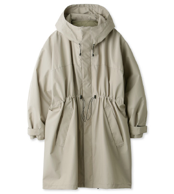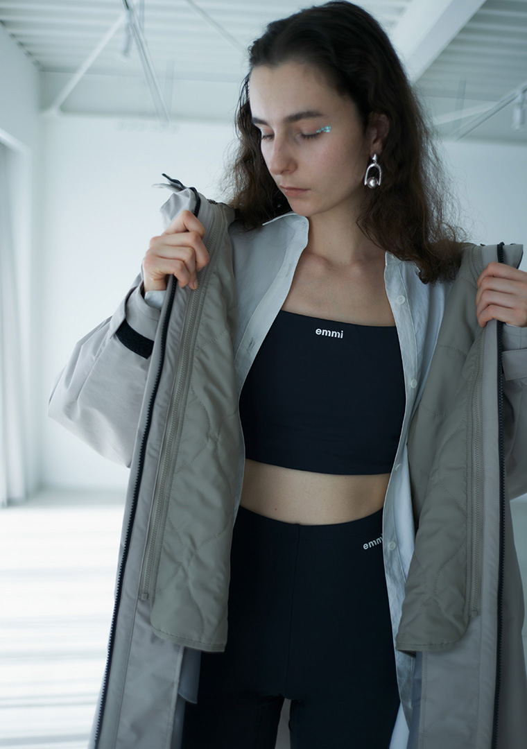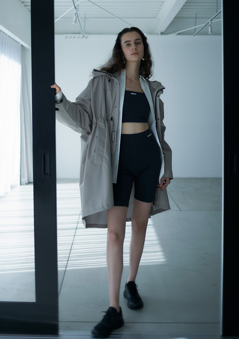 マットな風合いとスタンドカラーがモードな印象のブルゾン。 軽い着心地と撥水機能で、アクティブシーンにも活躍。 取り外し可能なライナーは単体で軽羽織として着用も可能。 ヨガウェアとスニーカーをダークトーンで揃え、モードなスタイルに仕上げました。
