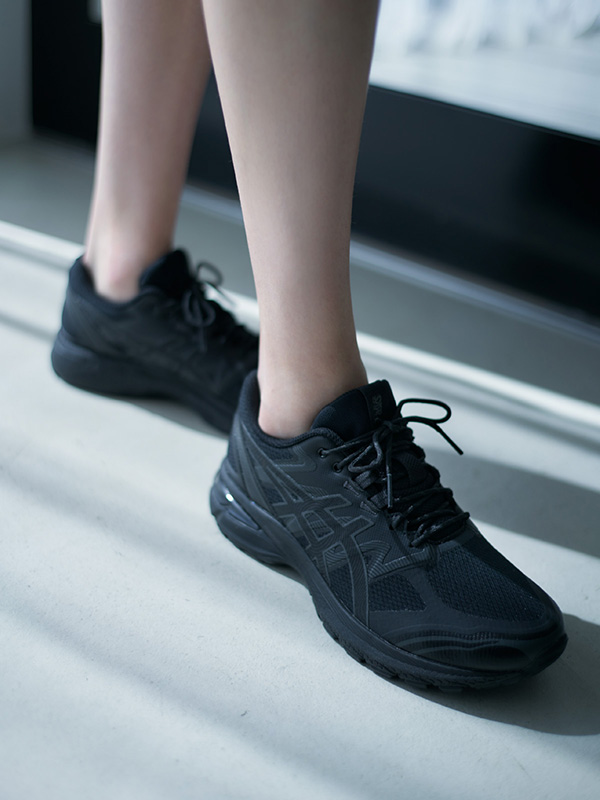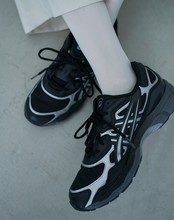 ボリュームたっぷりのシルエットのブラウスにハンサムなパンツを合わせた春らしいクリーンなスタイル。 足元には、ブラックのベースにアッパーのシルバーデザインが印象的なGEL-NYCをプラス。 ヘリテージとモダンランニングスタイルからインスピレーションを得たモデルはコーディネートをモードに格上げします。