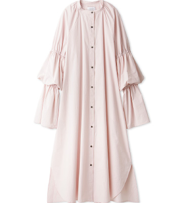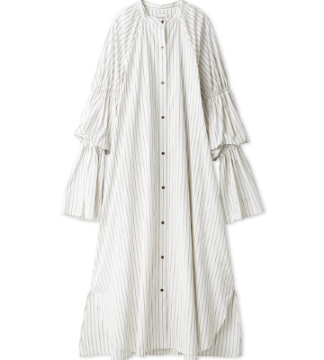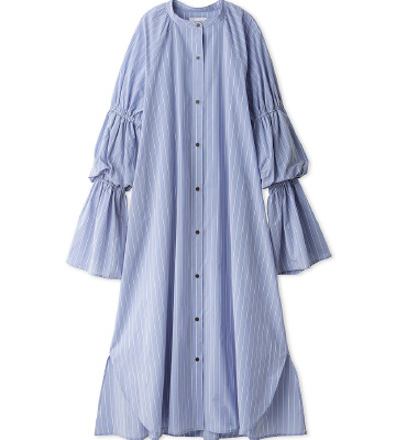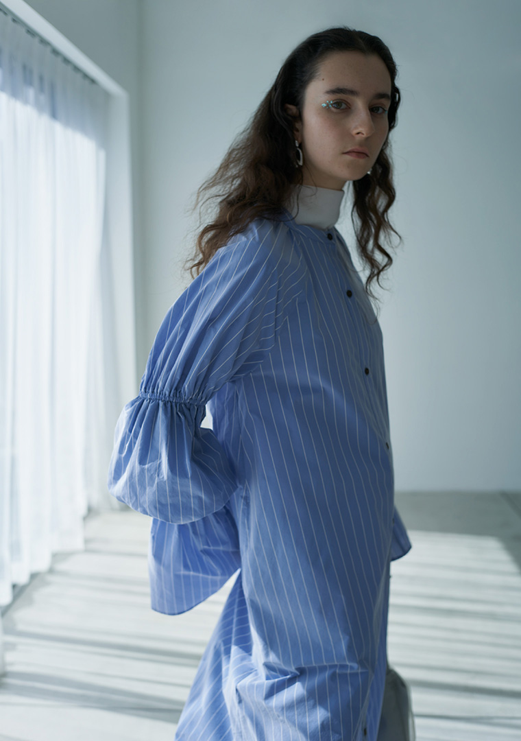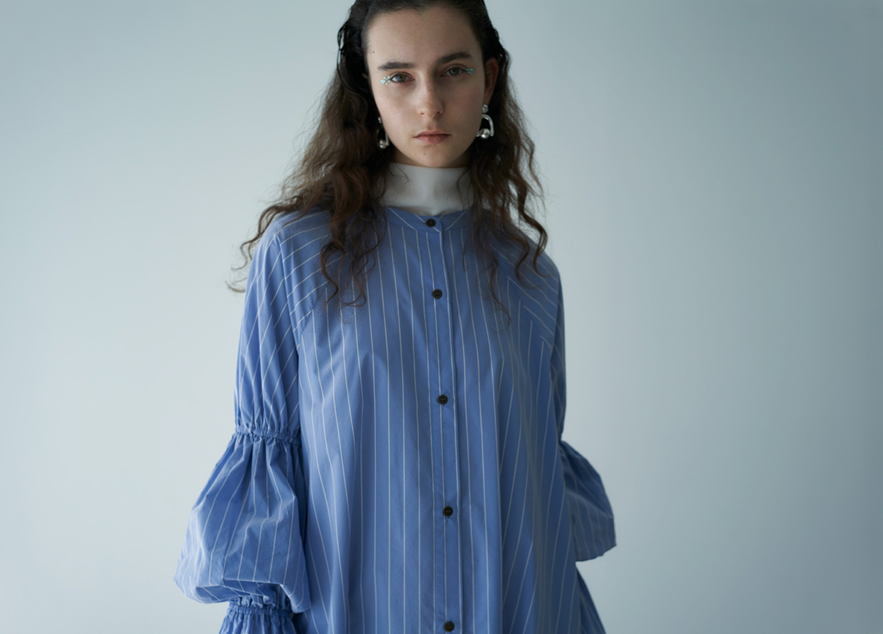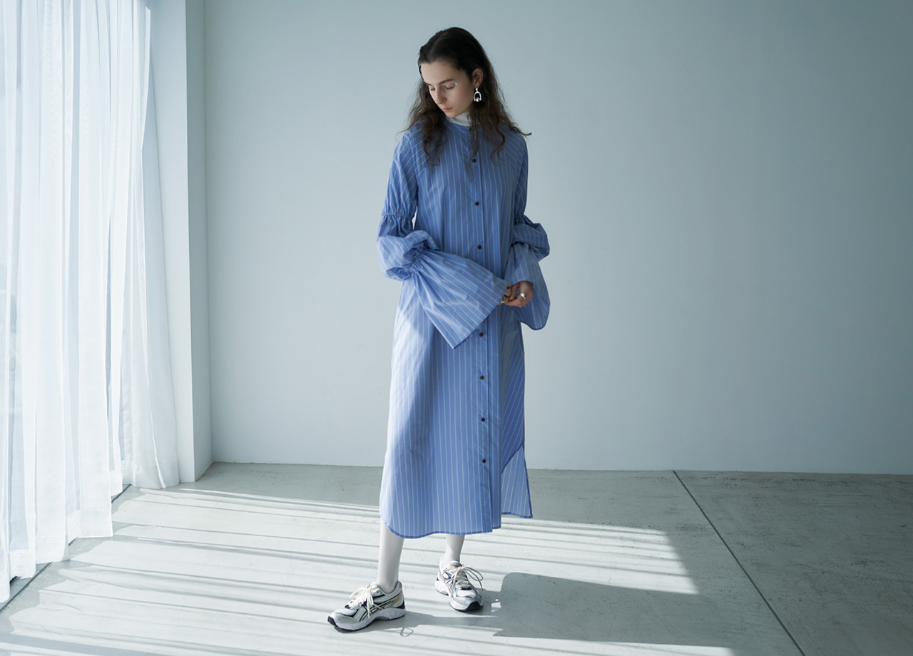 ゆったりとしたシルエットにボリューム感のあるキャンディスリーブが印象的なワンピースを主役に。 首元はすっきりとしたバンドカラーで、ドレスとしても羽織としても活躍します。 足元には流線的なゴールドカラーが効いたGT-2160を合わせ、甘すぎないドレススタイルが完成します。