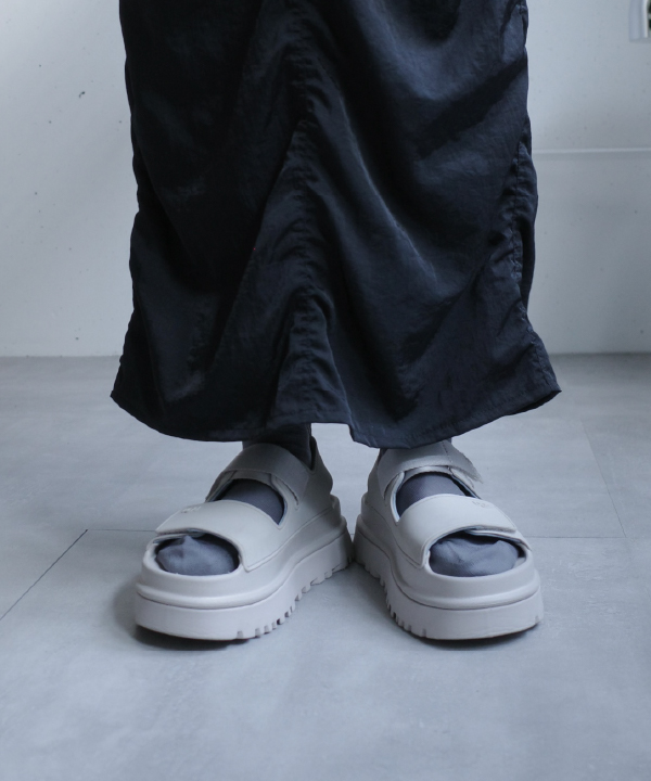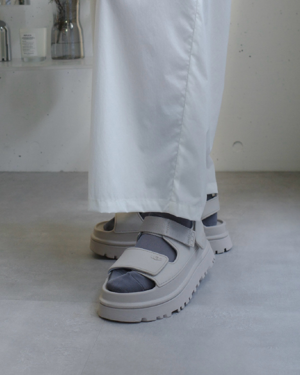 今季UGGのグローバルフォーカルモデルであるGoldenGlow(ゴールデングロウ)のカラー別注。 驚くほど軽量で履き心地も抜群、水にも強いサンダルでどんな天候でも活躍してくれます。 サトウキビ由来のEVAからできた厚底のソールがフレッシュな印象のモデルを、 シックなシルバーグレーでワントーンに染め上げました。 内側にはさりげなくブルーフォグのカラ ーを入れ、遊び心をプラス。 シアーソックス合わせでトレンド感ある履きこなしも叶います。