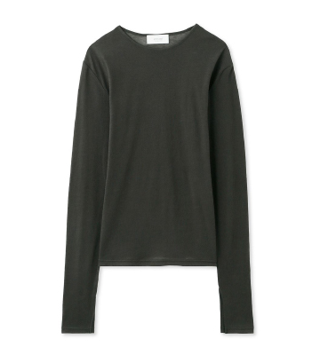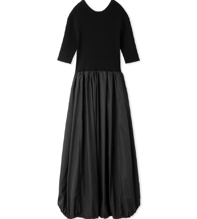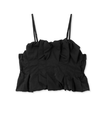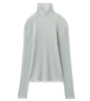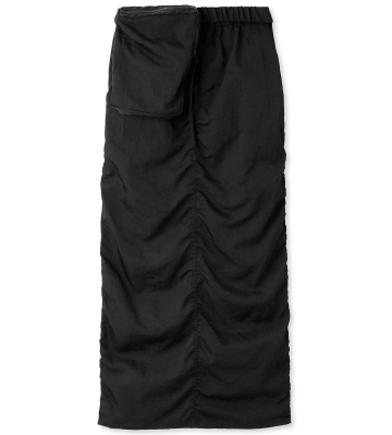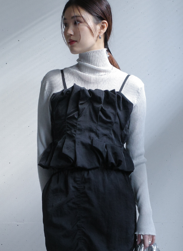 表情のある素材とデザインが印象的なブラックのセットアップは、透明感のあるトーンのアイテムを合わせて軽やかさをプラスしました。トップスはタートルネックだけどシアー素材なので、春にも使いやすいデザインです。グレージュのサンダルを合わせて、足元をはずすことでデイリーに落とし込みました。