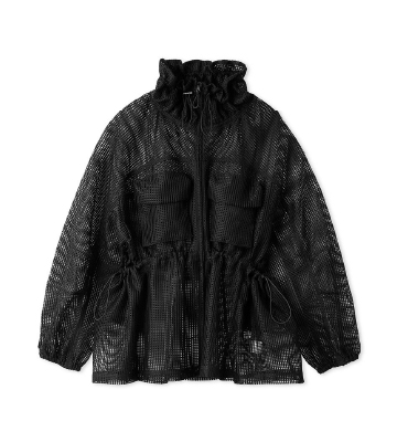 カジュアル合わせでは、撥水ワッシャーブルゾンとコーディネート。襟周りにギャザーが入っていることで、カジュアルになりすぎずに着られるのがポイント。メッシュ素材なので黒でも重くならず、インナー次第で様々なスタイルを楽しめます。トラックパンツの裾はジップの開け具合でも違う雰囲気に。センターシームのおかげでラフすぎず、大人カジュアルスタイルに合うおすすめの一着です。