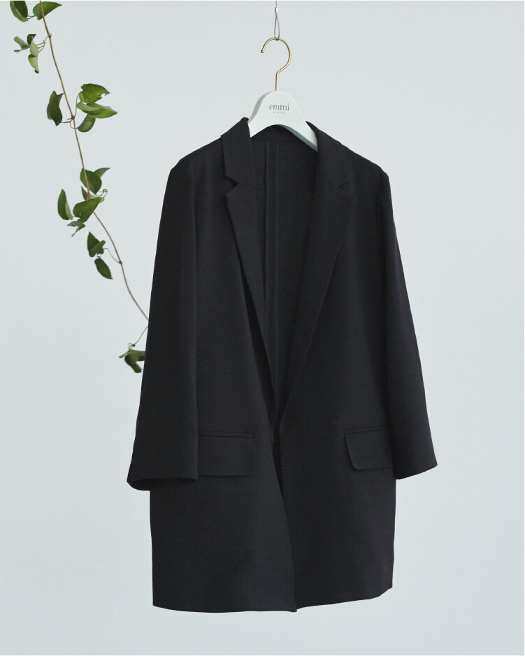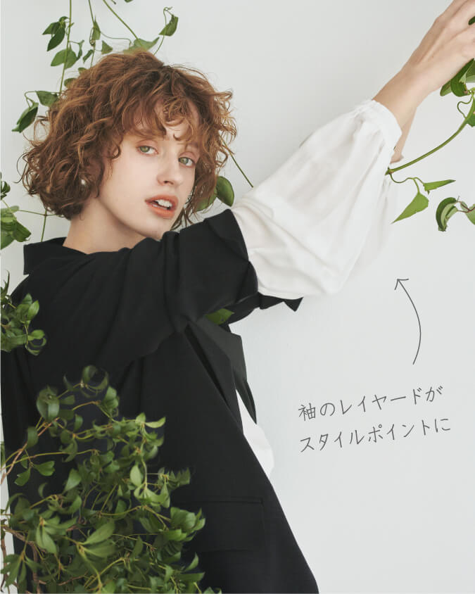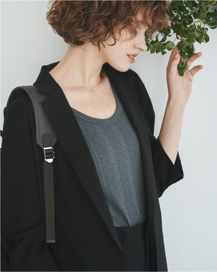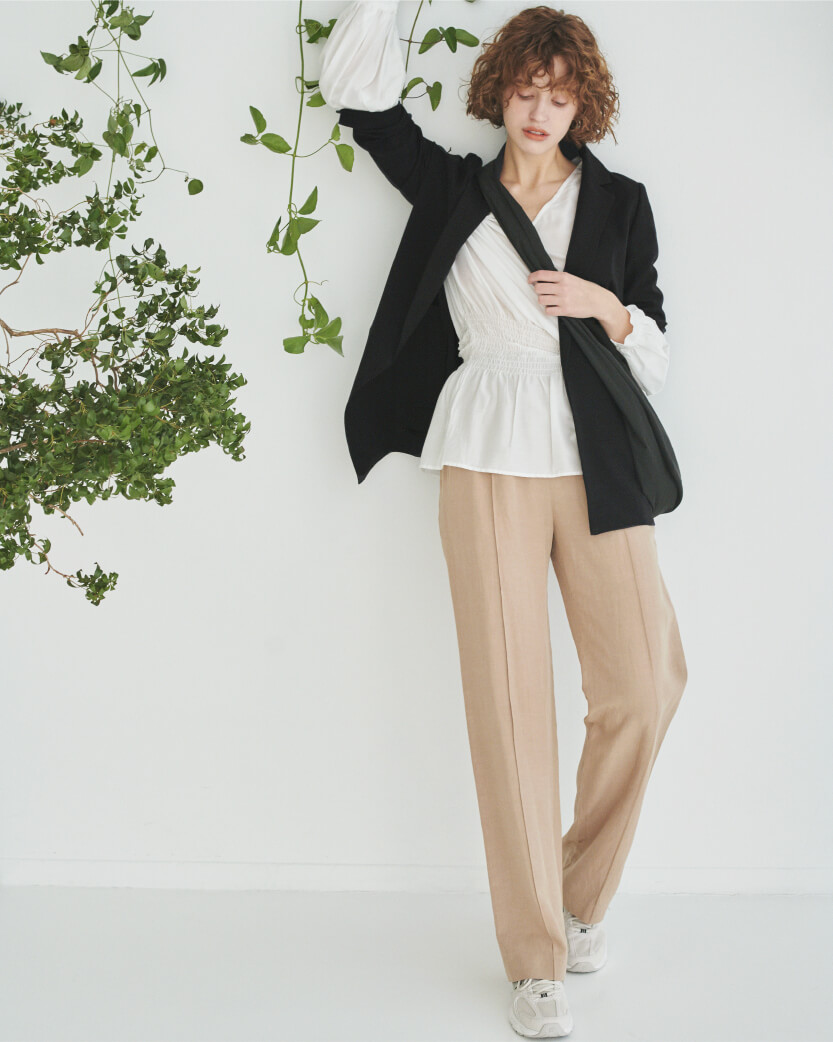 袖丈が短めだからできる、ブラウスとのレイヤードスタイル。ブラウスの軽やかさをのぞかせることで、ブラックのジャケットスタイルを軽やかに。ベージュのパンツを合わせれば、柔らかで、上品な綺麗めスタイルが完成します。足元もヌードカラーでなじませると、春らしい軽やかさが高まります。
