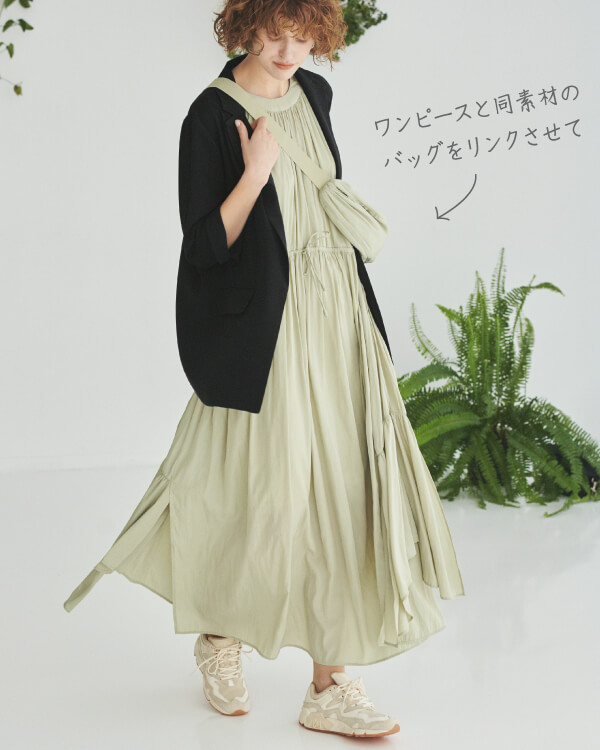 ワンピースはemmiの定番、ワッシャー素材を使用。自宅での洗濯が可能で、濡れてもすぐに乾く吸水速乾性素材を採用しています。また、洗濯しても綺麗なワッシャーはそのまま。旅行先でも活躍する一枚です。ボディバッグは、ワンピースと同素材。ショルダー部分はゴム仕様で使いやすさも秀逸です。
