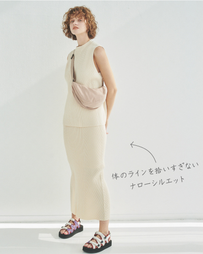 トップスは体のラインを拾いすぎずリラクシーに、スカートはナローシルエットで、上下で着たときのバランスも抜け感のある旬なデザインです。少し幅広なリブも快適な着心地に。自宅での洗濯ができるニット素材なので、汗ばむこれからの季節にも安心。一緒にセットアップで着るのはもちろん、別々でも着回しやすいアイテムです。