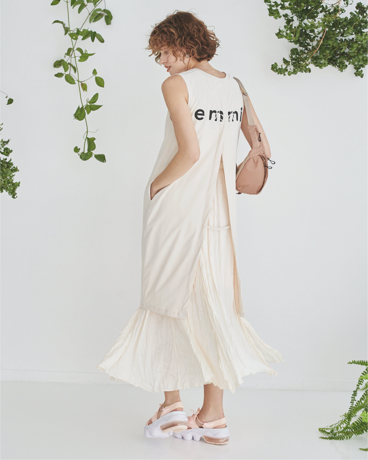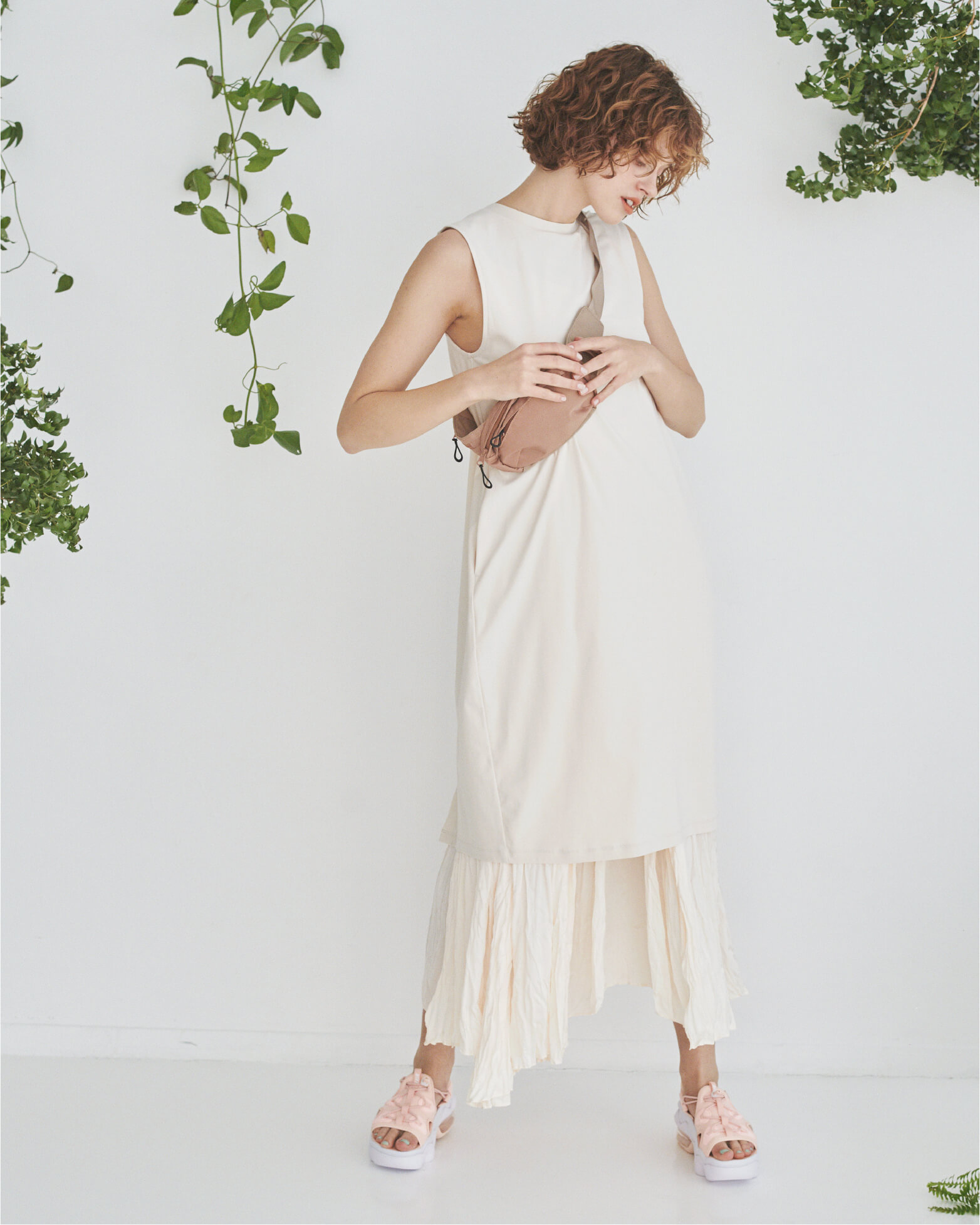 ロングトップスにキャミソールワンピースをセットで。ホワイトカラーに近いクリームのようなベージュのような…、そんな爽やかなカラーを引き立てるために、バッグもシューズも同系色でまとめて、爽やかなグラデーションを作りました。ワンピースの異素材の重なりがとても今っぽく、それだけでサマになります。