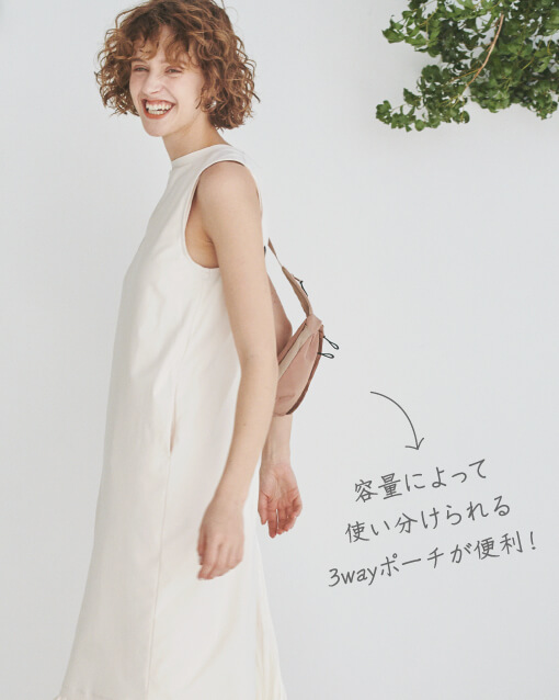 ウエストポーチは3way。ポーチと巾着が一緒になったアイテムで、ポーチだけ、巾着だけ、また両方を装着して使える荷物の量によって使い分けることができます。サンダルは新作のNIKE KOKO SANDAL。emmi限定カラーのPNKは、肌馴染みもよく着こなしの程よいポイントに光ります。