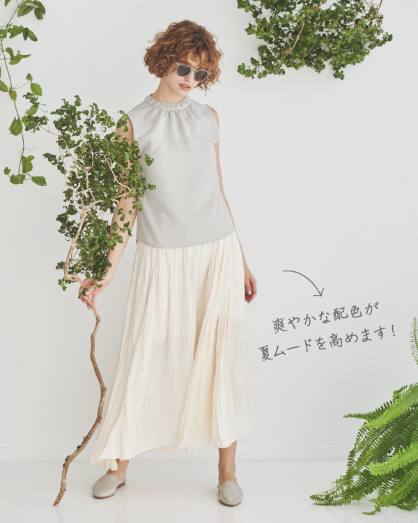 トップスをライトグレーのブラウスにチェンジ。キャミソールワンピースの薄いベージュに、ブラウスのライトグレーの爽やかさ溢れる新鮮な配色は、とても夏らしい。シンプルなトップスですが、首が詰まっているデザインだからスポーティになりすぎず、バランス良く着ることができます。足元は同系色のバレエシューズで優しくまとめてレディな雰囲気に。