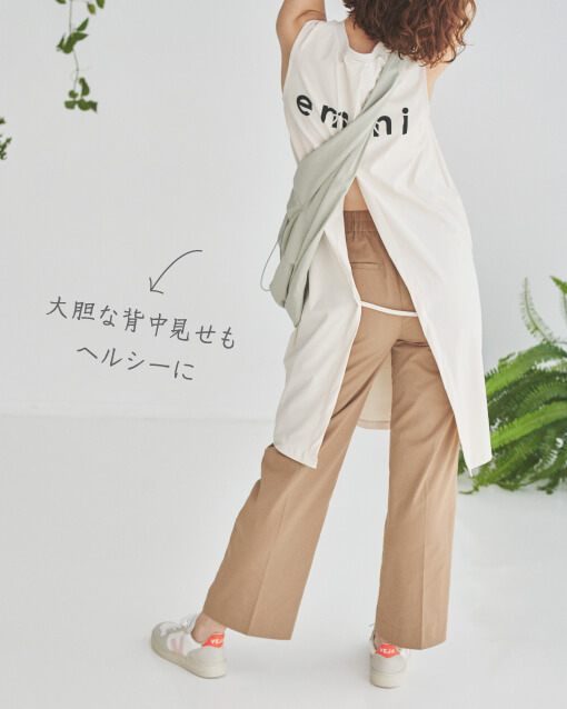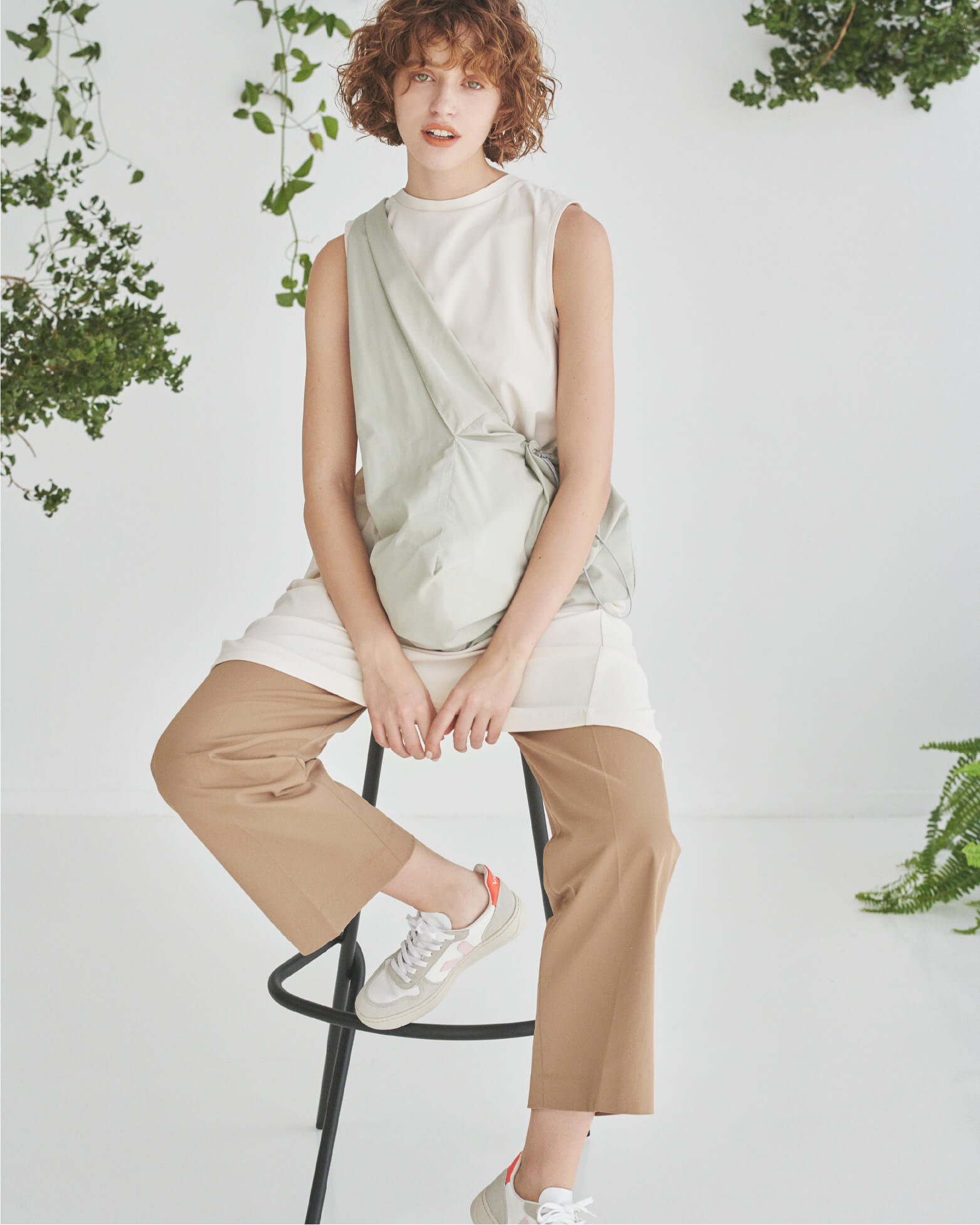 シンプルなデザインで、着回し力に優れたチノパンライクなイージーパンツは、程よくワイドなシルエットで、レッグラインを綺麗に見せます。吸水速乾、UVカット、ウォッシャブル、接触冷感、ストレッチ…と多機能でストレスフリーな着心地も魅力です。足元には、サステナブルな物作りで注目を集めるVejaをチョイス。emmi限定カラーです。
