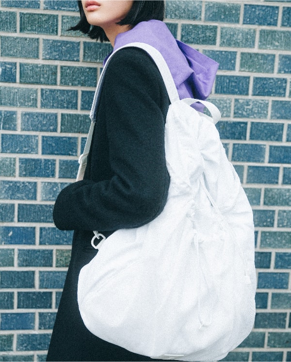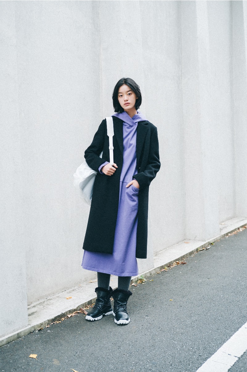 ストンとしたシルエットで、ストレスなく着心地のいいフーディワンピ。 動きやすさを重視して、バックにスリットを入れています。 ナイロンバッグとボアづきブーツのモードな素材感とあいまって、完成度高く仕上がります。