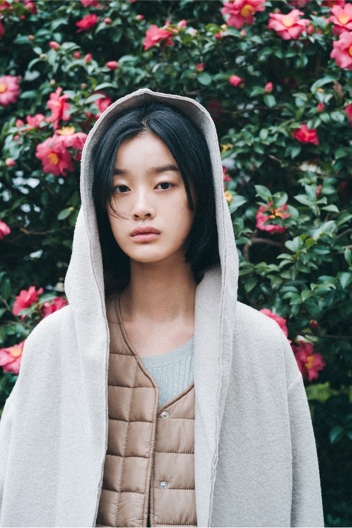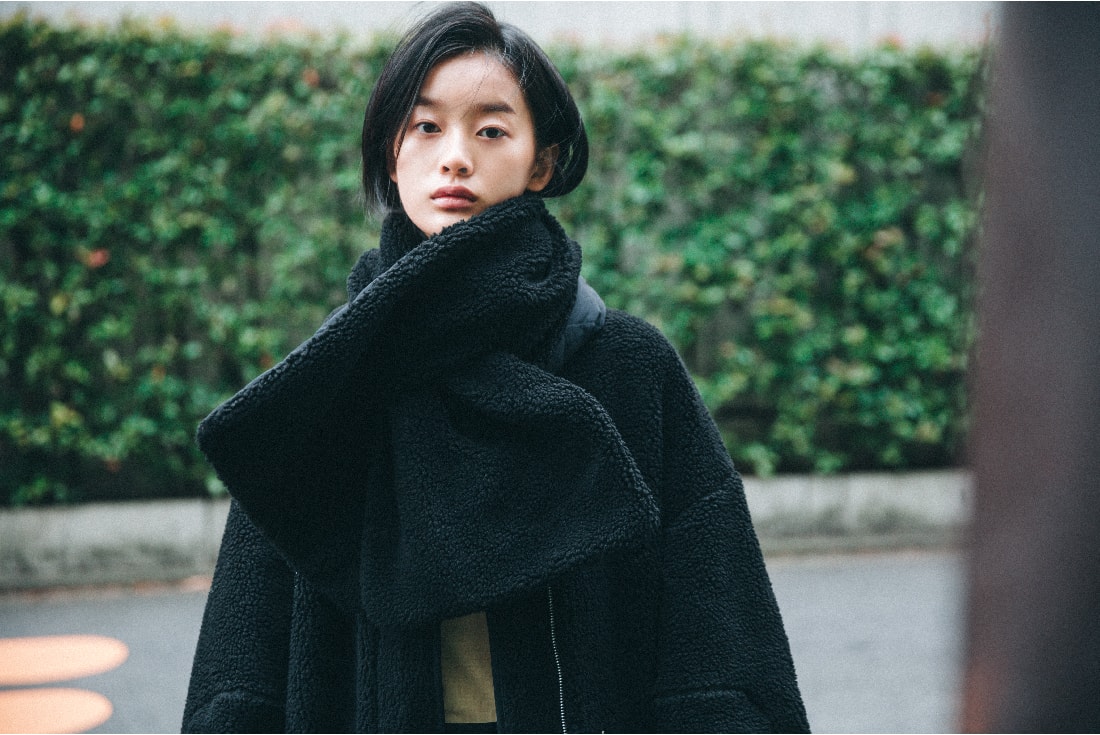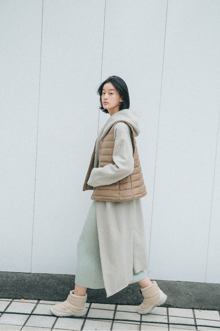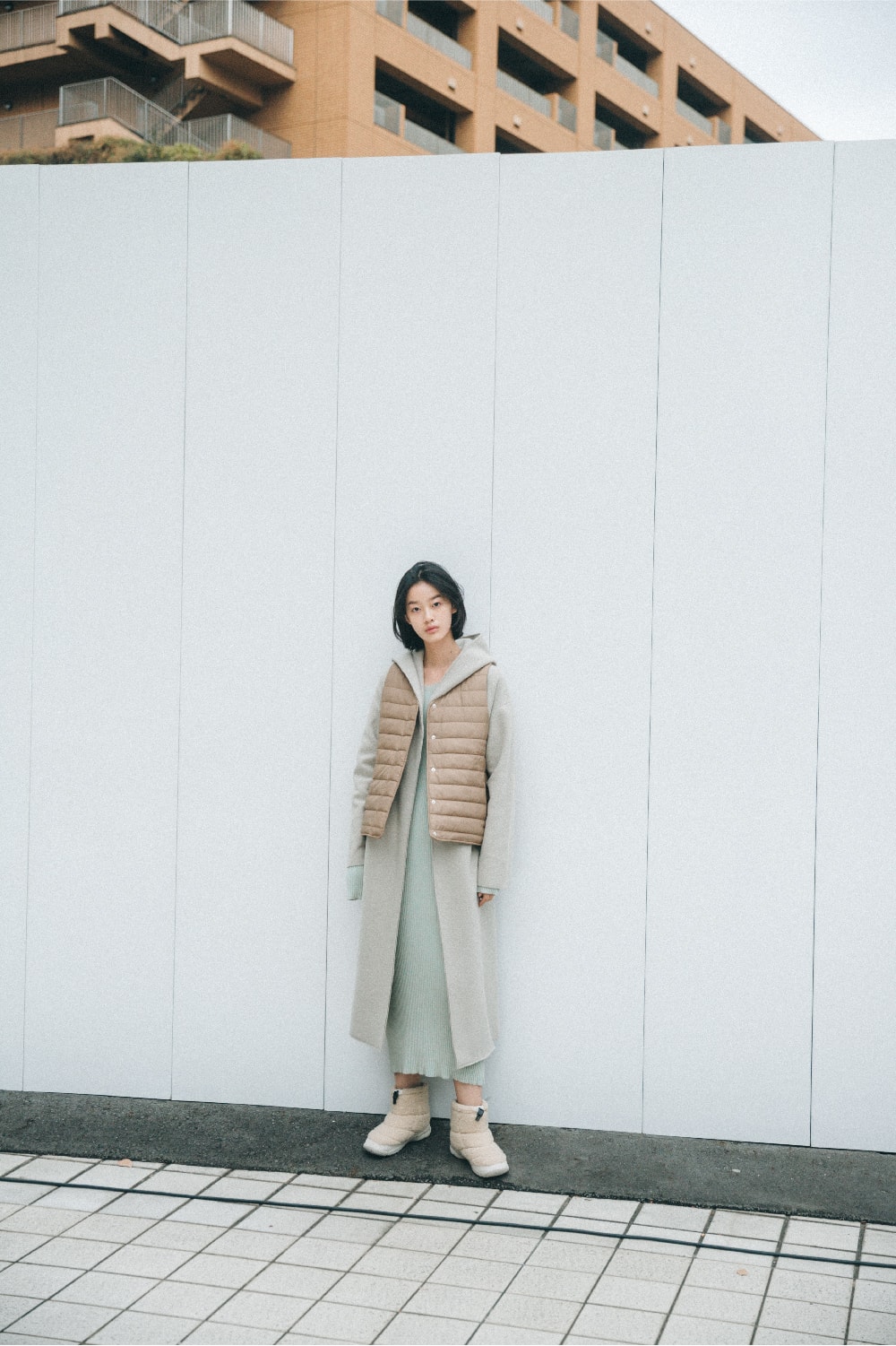 ダウンベストつきの暖かなウールコートのインナーに、ペールトーンのリブニット。 素材は暖かく、色合いは春を思う淡いトーンで仕上げました。 外はまだ寒いから、足元はemmiが別注をかけたTHE NORTH FACEの名作 「ヌプシブーティー」で防寒を。
