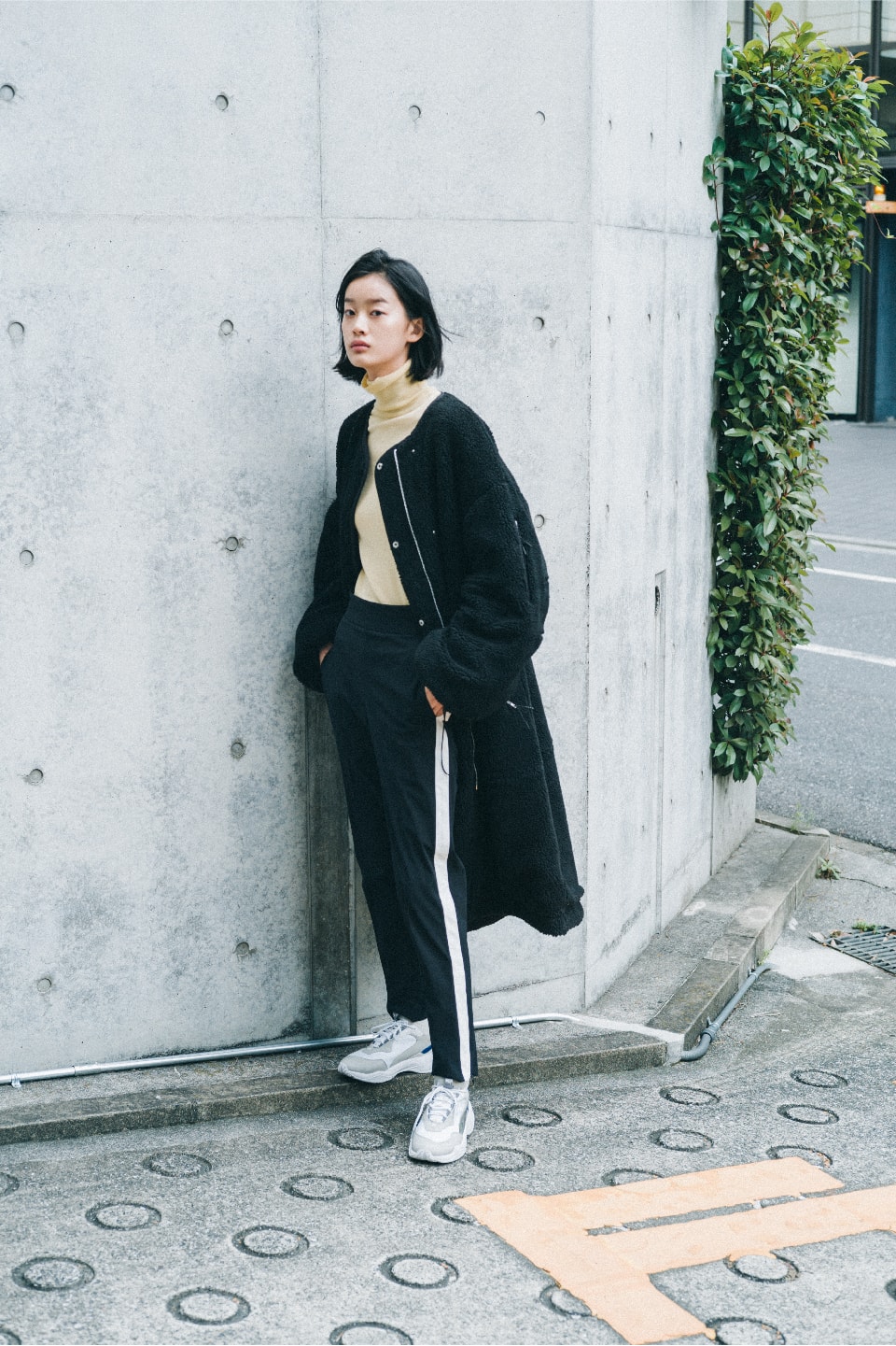 ボリューミーなボアコートのインは カラーニットとラインパンツで軽やかに